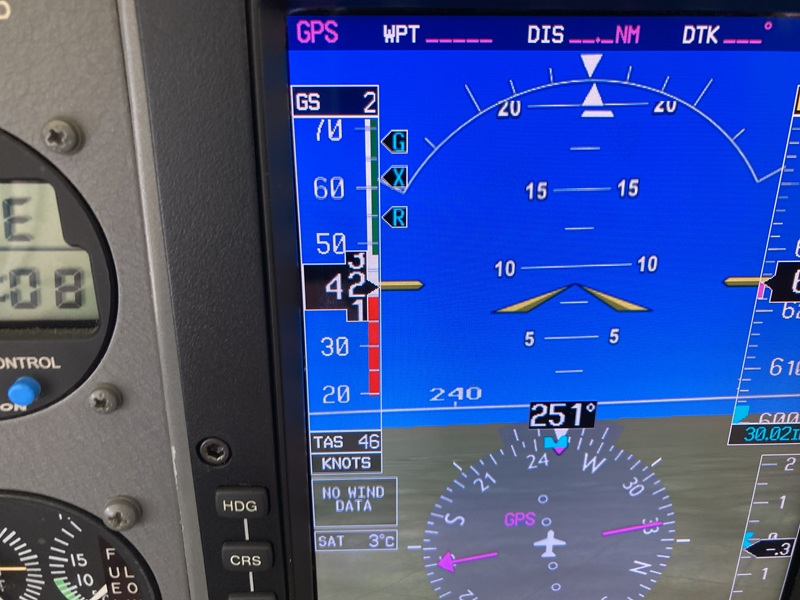 計器のGSというのが対地速度。飛行機は風上に向かって45kt程度で飛んでいるけど、風が同じ速度で押し返してくるから、地面に対しての速度はほぼゼロになる。ビデオの中では最低対地速度は6ktぐらいだったけど、6000ftまで上がって同じことをトライしたら、対地2ktまで減速することができた。