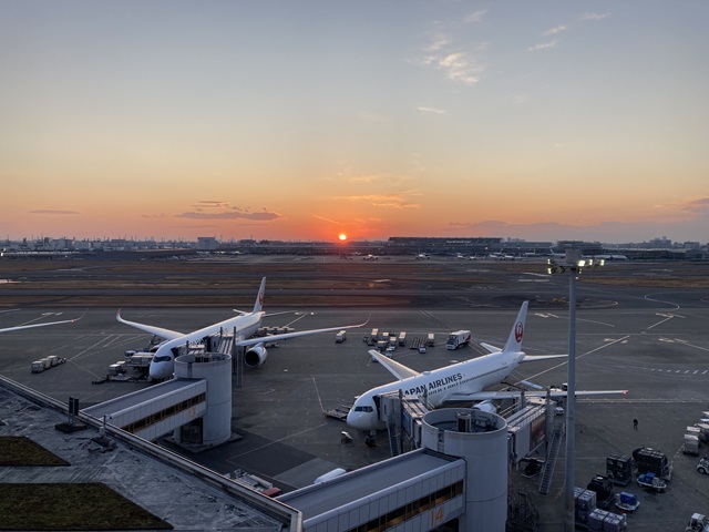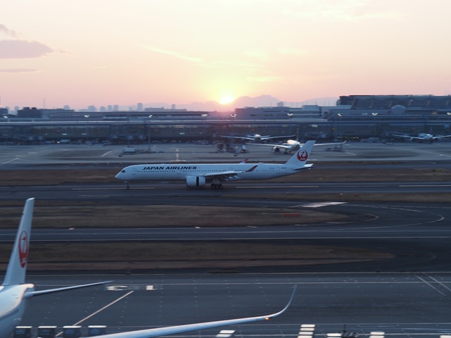 そして、3時、ホテルに行ってチェックイン。荷物など回収して部屋に置く。4時過ぎの飛行機で我が妻は羽田空港に到着するはず。第一ターミナルの展望デッキで待つ。展望デッキからは見事な日の入りを見ることができたが、我が妻の乗る飛行機は海側の滑走路に降りたので、撮ることはできなかった。